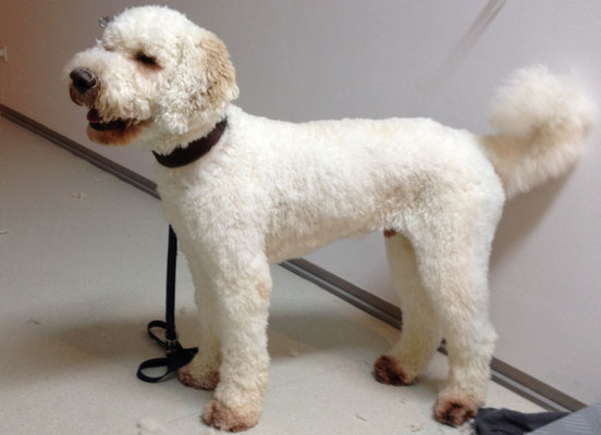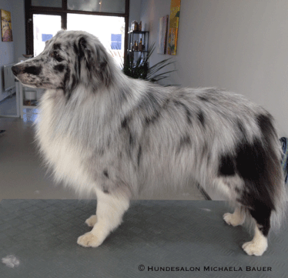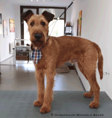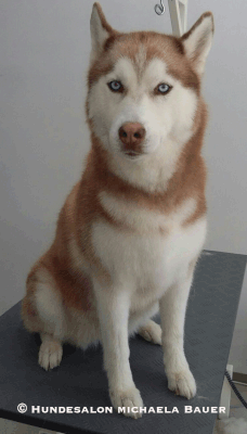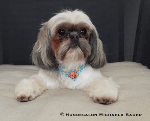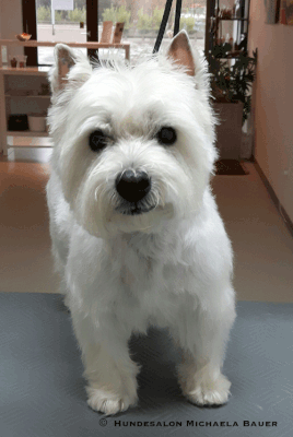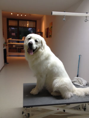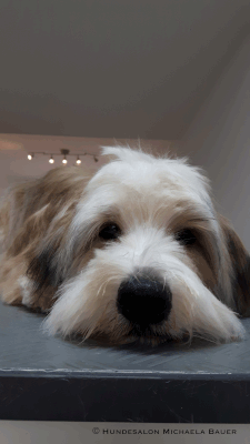 Das ist der Arbeitsbereich. Ich arbeite auf einem professionellen, stabilen Tisch. Die Verwendung des Galgens dient der Sicherheit Ihres Hundes und bedeutet entgegen anders lautender Meinungen keinen Stress für ihn. Er funktioniert wie die Leine, welche Sie zur Sicherheit Ihres Lieblings auf der Straße verwenden, damit er in kein Auto laufen kann. Im Hundesalon kann er ohne dieses Hilfsmittel in einem Augenblick der Ablenkung vom Tisch springen und sich verletzen. Das gilt es jedenfalls zu vermeiden!